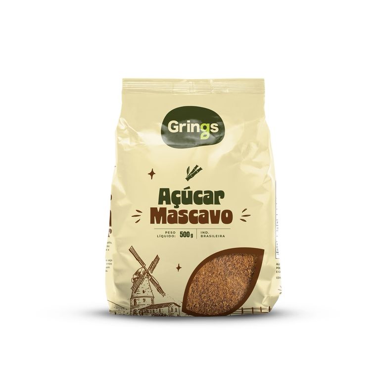 Açúcar Mascavo Grings (500g). Sabor intenso de melaço. Retém mais vitaminas e minerais que os açúcares refinados.