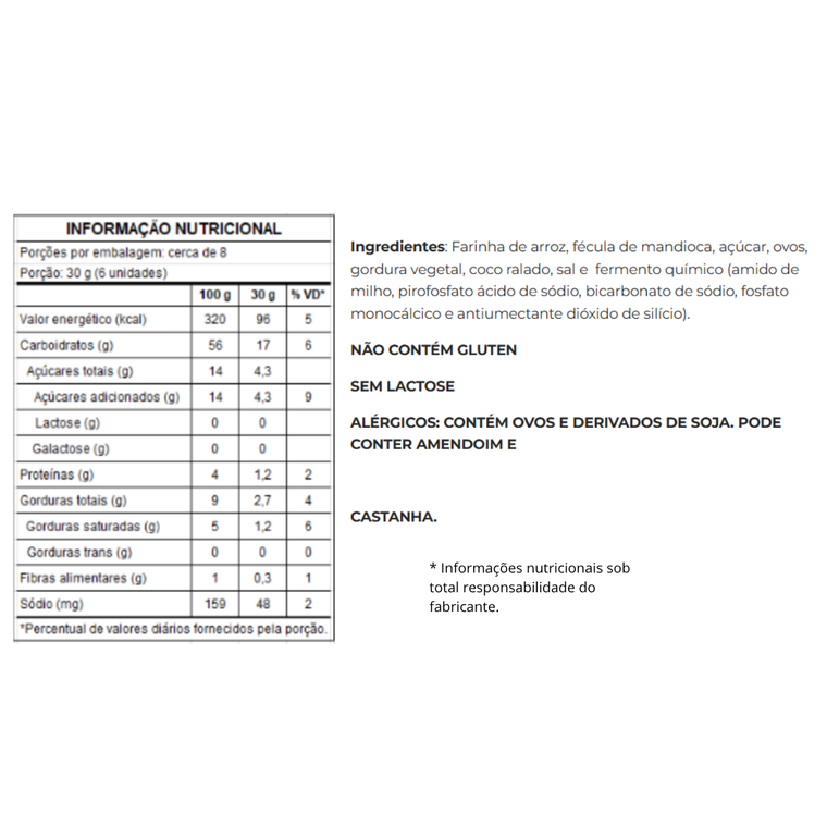 Biscoito de Coco (250g), crocante e com sabor tropical. Opção leve e Sem Glúten.