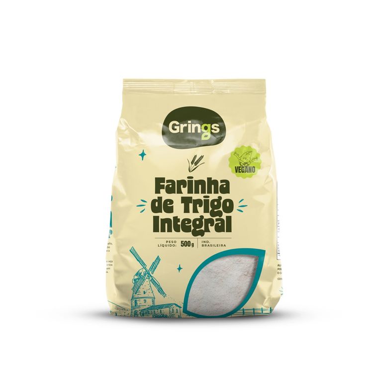 Farinha de Trigo Integral Grings (500g). Preserva farelo e gérmen. Rica em fibras, vitaminas e minerais.