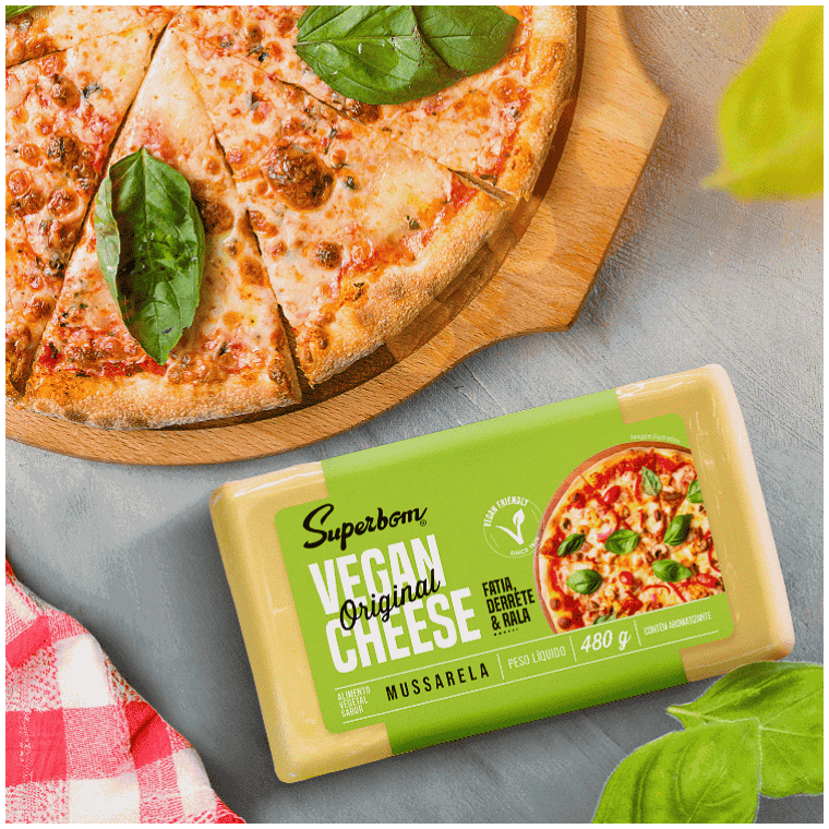 Vegan Cheese Mussarela Superbom (480g). Plant-Based, Sem Lactose. Derrete e estica perfeitamente em pizzas.