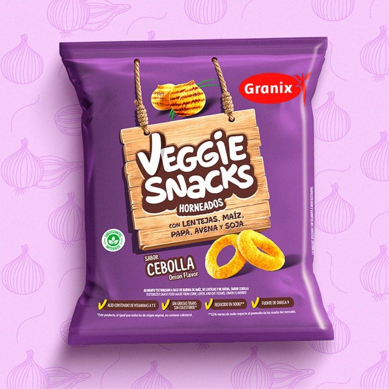 Veggie Snack Cebola Granix (45g). Vegano, Assado. Sabor intenso de cebola e fonte de fibras.